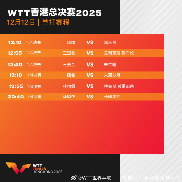 发布日期:2025-12-26 14:06 点击次数:164北京技巧12月12日音书,2025年WTT香港总决赛投入第三个比赛日的争夺,CCTV5、CCTV5+现场直播比赛实况。其中,孙颖莎、王楚钦、蒯曼迎来一日双赛,他们除了出战单打比赛以外,还要出战搀杂双打,极端磨练体能。